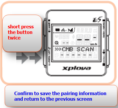 While E5 successfully paired successfully with a Combo Cadence Sensor, After Combo Cadence sensor complete to pair with E5, you have to short press the button “LAP/RESET” twice. Confirm to save the pairing information and return to the previous screen.