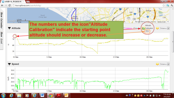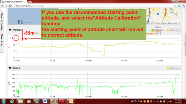 Once the altitude of starting point of activity record have error value, the cloud tour.xplova.com will remind the difference value. If the user is willing to replace the system recommends starting point altitude, select the icon "Altitude Calibration”.