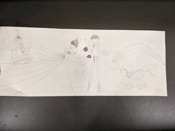 基於老王賣瓜的心態,回到家後忍不住和親友們分享這幅隨手畫在餐紙上的作品,那是一幅王子公主結婚圖,後方有個可愛的小城堡,一旁還有隻長了翅膀的獨角獸;雖然不免稚氣,卻畫出了六歲小女孩心目中的幸福和純真。