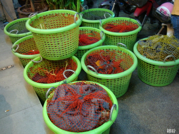 ▲店家門外放置著一簍一簍的螃蟹,這可是一晚的消費食用量?