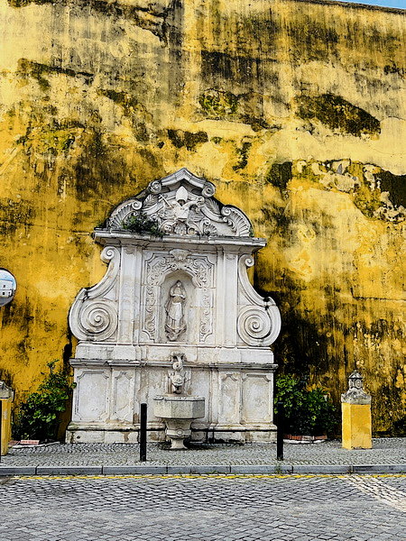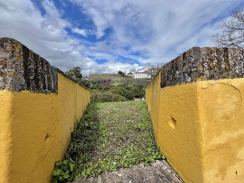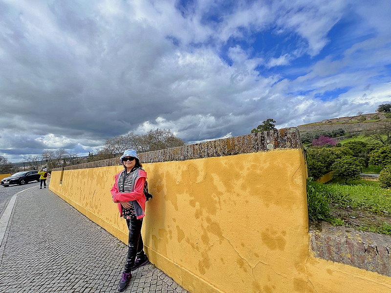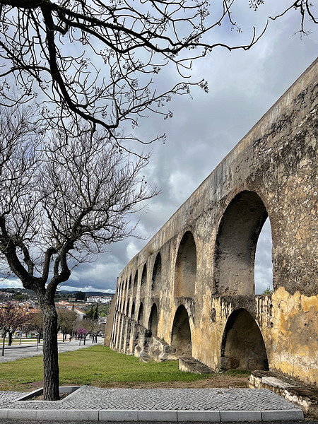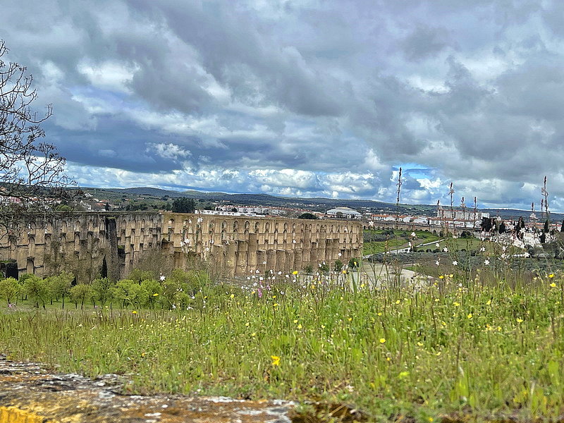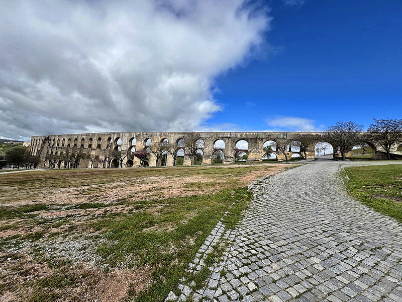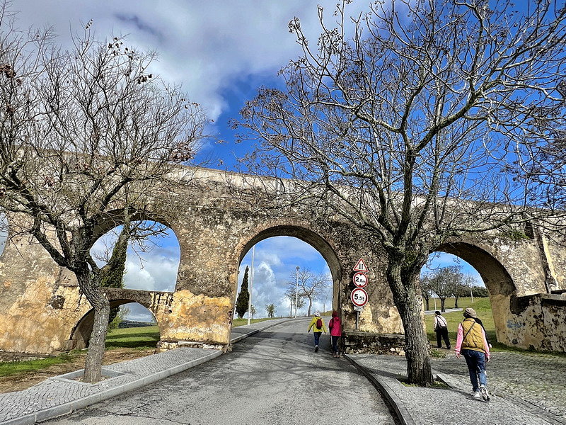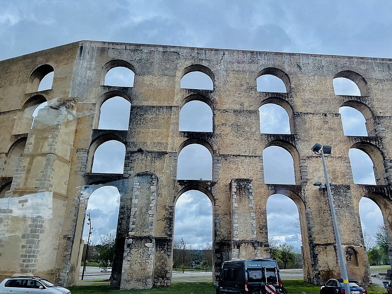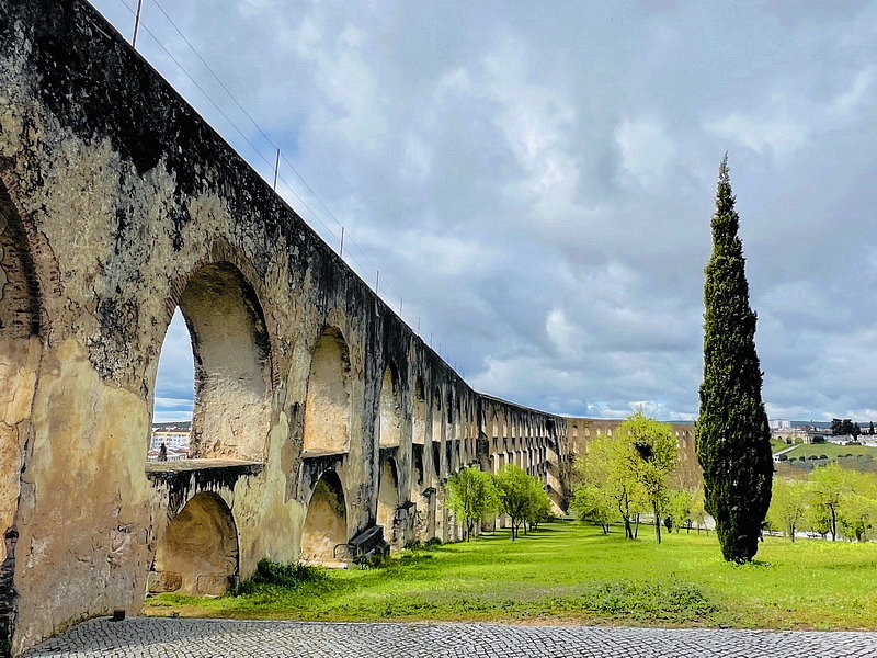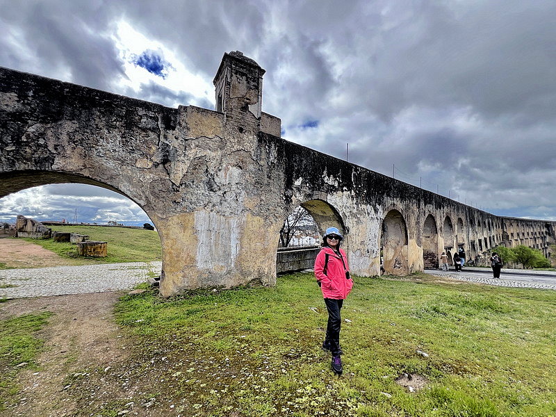 這一排壯觀的建築,乍看原以為是城牆,其實是導水管渡槽Amoreira Aqueduct。建於1498年,蓋了120多年才完成,總長大約8公里。1910年時列入聯合國世界文化遺產,現在埃爾瓦什市民用的水,仍然靠這個導水管渡槽供應。
