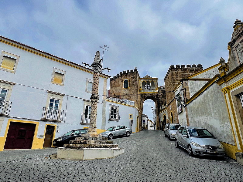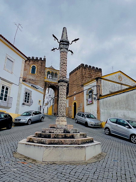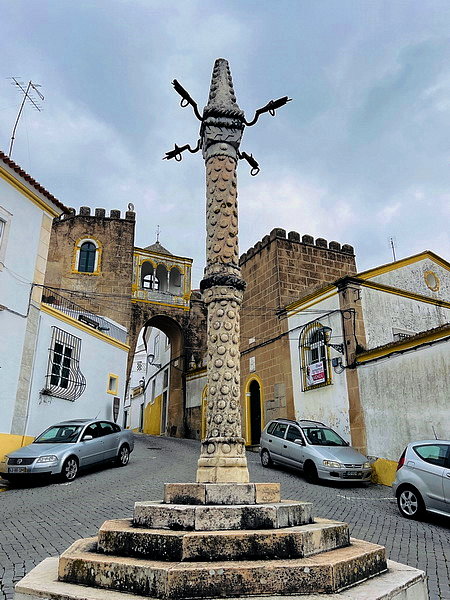 埃爾瓦什的市中心 Santa Clara 廣場;這個石柱是中世紀時的刑具,頸手枷Pillory,上面有四個吊鉤。