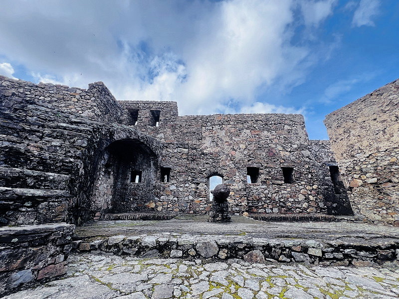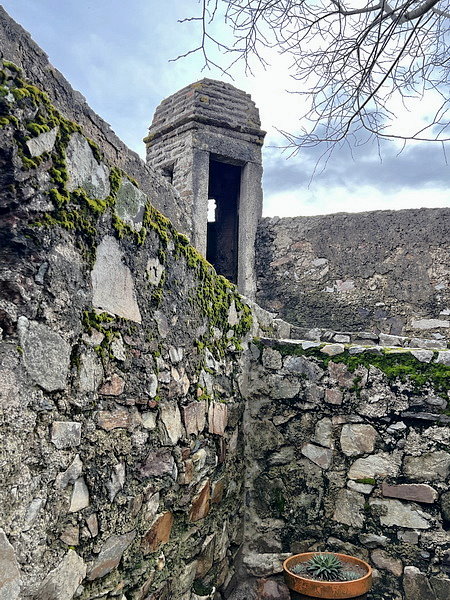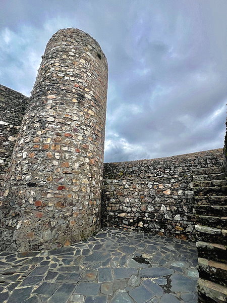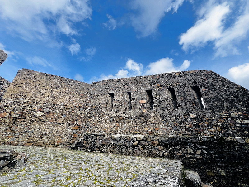 城牆完全由岩石所建成,旁邊有以前留下來的砲管,對著山腳下的平原。往牆邊走去,可以看到山城邊緣的山壁,陡峭的山壁形成天然壁壘。