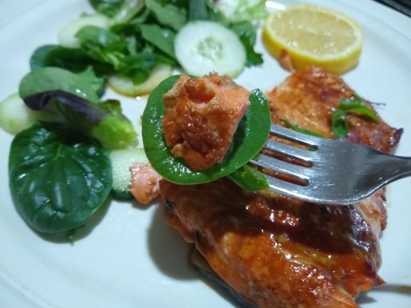 5~6人份(全家福,所需時間:20分鐘 好市多鮭魚1 片 油12 克 黑糖蜜12 克 醬油12 克 煙燻紅椒粉2 克 小磨坊香蒜黑胡椒3 克 現擠檸檬汁 可有可無 作法: 魚擦乾,皮朝下,放到烤盤上, 用手指檢查有無魚刺 (好多要小心,上次被老三吃到哎好久), 把其他所有材料拌勻,抹在魚表面。
