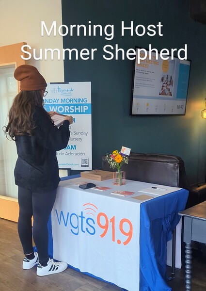 電台主持人(早上5點到10點時段) Summer Shepherd and I 昨天早上11點到下午一點, 美國福音電台 WGTS91.9 Fm 車隊又來到番媽家附近的咖啡館, 一起聚會、聊天、喝咖、禱告, Summer拿起她的手機拍了這張照片! 她表情也太口愛了吧! 她超厲害年紀輕輕是四個小孩的娘!