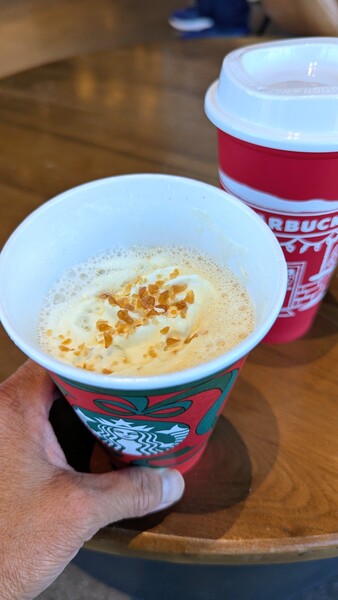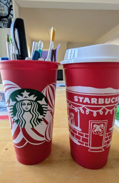 今天是星巴克一年一度的紅杯日 Red cup day 只有買聖誕飲品(大小不限), 就免費送一個紅杯子,送完為止! 去年和今年的紅杯圖案不一樣 去年的紅杯被我拿來當筆筒😁😁😁