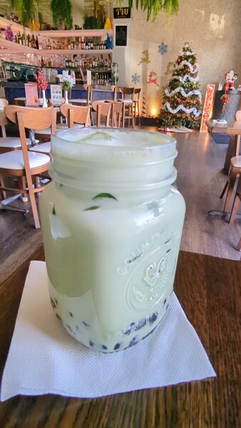 他點了 Honeydew boba milk tea (甜瓜珍奶)