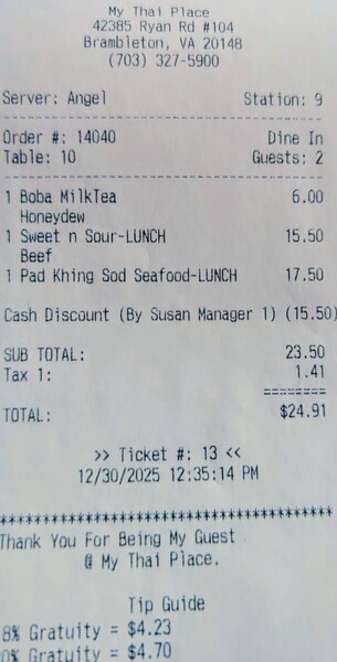 老大點的 sweet and sour beef( 甜酸牛肉) 我家社區開很久的泰國餐廳 My Thai Place Restaurant 地址:42385 Ryan Rd Suite 104, Brambleton, VA 20148 又有了買一送一的折價卷(限weekdays 使用), 所以找了午休的老大來吃, 他說他還是比較喜歡旁邊的亞州餐廳(Asian spice), Lunch specials 還有附飲料, 老板還送了他很漂亮的農民曆😁😁😁 My Thai place