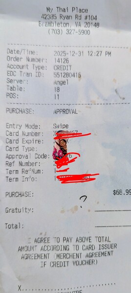 有朋友 Leesburg 來,還是得要小心😁😁😁 請她和她兩位女兒吃泰食! 第一次遇到店員拿帳單來是已加20%小費的, 刷完卡再送來這張....要我簽