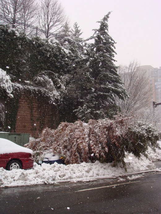 雪景雖美, 但路上的狀況可真不少, 有頂著雪的車子, 有被樹壓到的車子........
