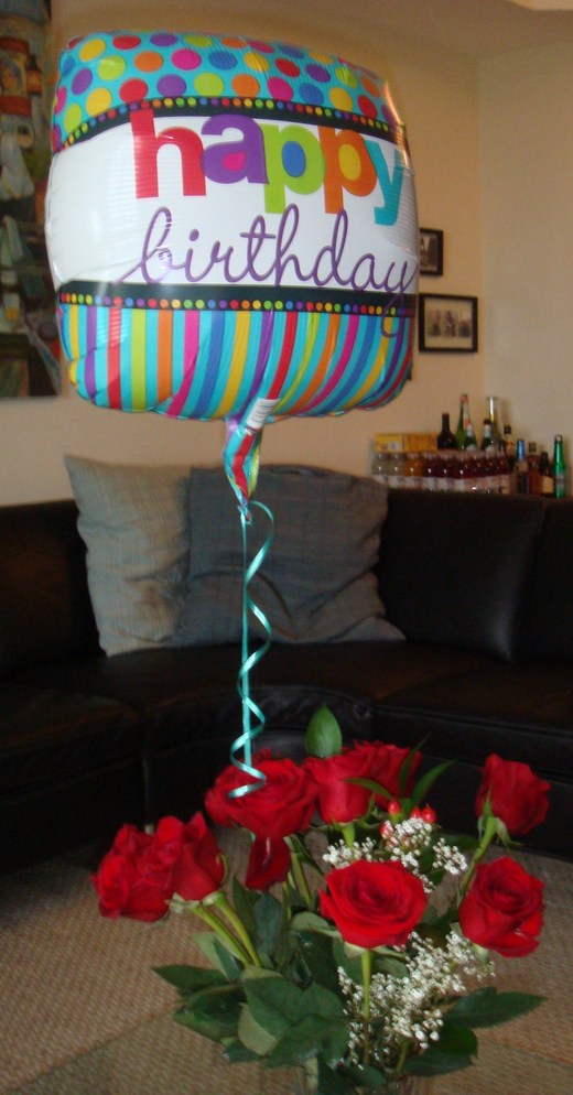 台北的朋友說聚餐, 聚餐完畢時突然有個蛋糕出現, 原來是提前幫我過生日, what a surprise! 本來心情陰天的我, 馬上轉晴! 生日的那天正好重感冒, 喉嚨痛, 頭暈, 全身肌肉酸痛....... 只想躺在床上, 那裡都不想去! 男友訂了 Ruth Chris 的燭光牛排晚餐也只好取消, 不過一進家門, 就看到餐桌上有一顆好大的汽球, 一打的玫瑰花, 好感動..... |