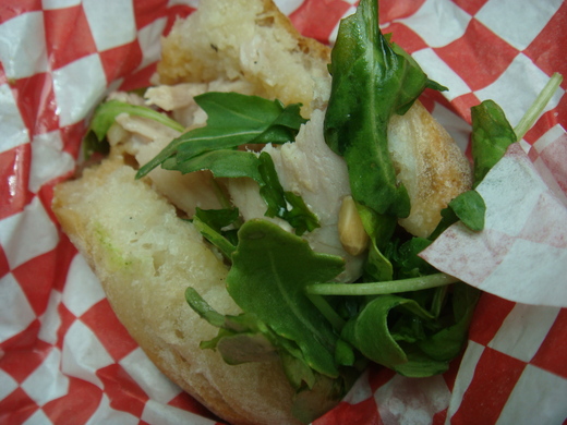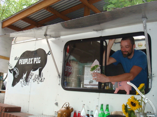在路上擺攤的各式料理的香味散佈在空氣中, 十分吸引人, 今天中午決定跟老外一樣吃外賣! 5攤裡面有 3攤泰國料理, 就找了一間人最多的來排隊, 叫了一份黃咖哩雞 $7, 再到另一攤買烤乳豬三明治 $8. 路邊攤耶, 竟然要價跟咖啡廳差不多, 更令我意外的是, 還有很多人給小費呢!? 我瞭解美國是一個小費文化之國, 餐廳的 15-18%小費, 還可以勉強的說服自己說比台灣多 5-8%而已 (美國沒有所謂10%的強制性服務費, 但一般15%的小費是最少的了, 表示這個server 服務普普通通, 18%是正常, 很多老外都給20-25%...), 但是路邊攤 plus 小費, 我可是怎麼樣都兜不起來, 好吧, 說我小氣好了! 黃咖哩, 坦白說, 太甜了點, 雖然料多飯足, 味道只能勉強說及格而已! 烤乳豬三明治, 沒想到波特蘭這麼多人吃烤乳豬, 肉嫩味美, 雖然有點小肥, 但是廚師加了檸檬汁之後, 反倒有去油膩的功效, 非常好吃! 賣烤乳豬三明治的老闆很親切的給我拍照! PS: 還好有人幫忙吃, 否則大概可以連晚餐都免了!