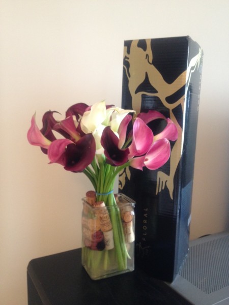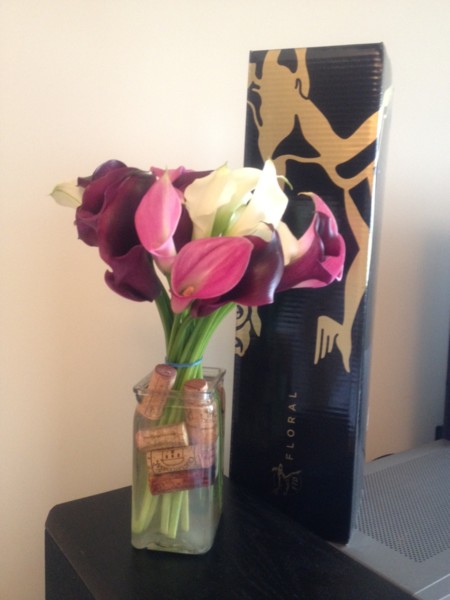 雖然今年不是玫瑰, 但收到花束的那一刻, 還是讓我驚奇不已... 從沒見過其他顏色的海竽, 也沒見過這小種的海竽, 插在瓶子裡, 走過的時候看著看著, 給我添加了好心情! 謝謝所有給我祝福的朋友, "要幸福喔"是最多朋友給我的留言. 真感動! 我相信, 幸福雖沒有掛保證, 但總能有期待. 幸福沒有必然, 但總能盡力經營. 幸福不需要奢華, 平淡也能甜蜜. 我會繼續努力維繫, 珍惜眼前的幸福!