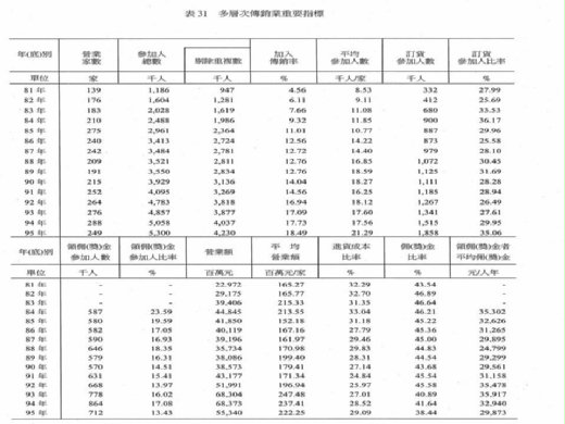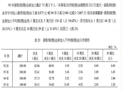 究竟傳銷的經營著收入有多少?是否如那些所謂分享者所言是年收入百萬?還是如最近被查獲某家傳銷公司自承是「誇大不實」?如何不讓傳銷業者或經營體系的opp說明者誤導而大做不切實際的白日夢,要求提出收入報表是一個可行的方式。不過,這往往因涉極了個人資料的保護,若當事人不願意,也是一件無可奈何的事! 不過,公平交易會的「多層次傳銷事業經營概況調查摘要分析 」可以讓整個傳銷產業的重要資料曝光,包括了本文所探討的收入部分。 從最上圖所示:傳銷從業人員的平均年收入自民國84年至今平均在新台幣三萬元左右,而參加者中能夠領到錢(佣金)的也不超過20%,也就是說只有不到20%的人能從傳銷賺到其他超過80%的錢,只是平均收入不很高。若從經營結構上來看,或許兼差型或消費型的傳銷商占了不少,但實際上卻看不出來。 至於傳銷業號稱年薪百萬以上的傳銷商究竟有沒有?從圖二來看,一年超過三十萬以上的並非沒有,但真的是如鳳毛麟角般的少,最多不超過1.5%,而這1.5%還是只發出這樣佣金的傳銷廠商。若以實際經營家數或是報備有案的家數來看都不超過十家。所以不能否定沒有年薪百萬以上的傳銷商,但這只是少數,並不是滿街可得的!一般而言傳銷的收入只不過是兼差的所得而已! 因此在談及傳銷事業時,制度規畫的願景是端賴個人是否努力達成的指標。而實際從事傳銷的平均收入真相卻可以做為是否投入的一個參考指標。如此才不會在一股熱勁消退後帶著受傷的心情反過來大罵傳銷騙人。 |