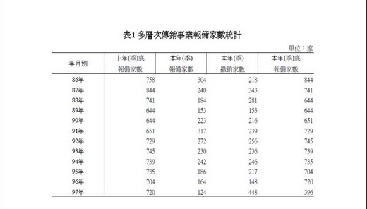 從公平交易會 所發布之九十七年度報備家數統計來看,傳銷業的報備家數竟然大幅縮減,由前一年的七百多家一下子銳減至不足四百家! 這所代表的意義是甚麼?是傳銷的榮景不在?還是淘汰了一堆子體質不良想撈一票走人的傳銷業者?!還是景氣不佳所造成的後果! 但從下表來看,報備家數與實際營業家數有著一定的差距,宜於目前未見九十七年的實際營業家數統計,所以很難看出報被家數大幅縮減的傳銷業究竟實際營業家數有無受到影響也隨之縮減?! 所以就實際營運的家數來看,從民國86年至96年的變動並不算大,而97年則資料未出很難看出,而報備規模的銳減,以及之前實際營運暨報備家數的極大差距,說明了有不少是只報備而未營運或是難以營運的狀況吧! 至於傳銷能否快速致富?看一下下表中「平均佣(獎)金」那一欄就可以了解這不是一個如同宣傳能夠「不努力而能快速致富」的行業!