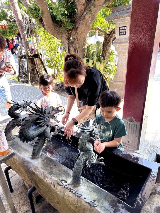 入境隨俗 小朋友學著日式參拜流程 手水舍~淨手 賽錢箱~投錢 一鞠二拍