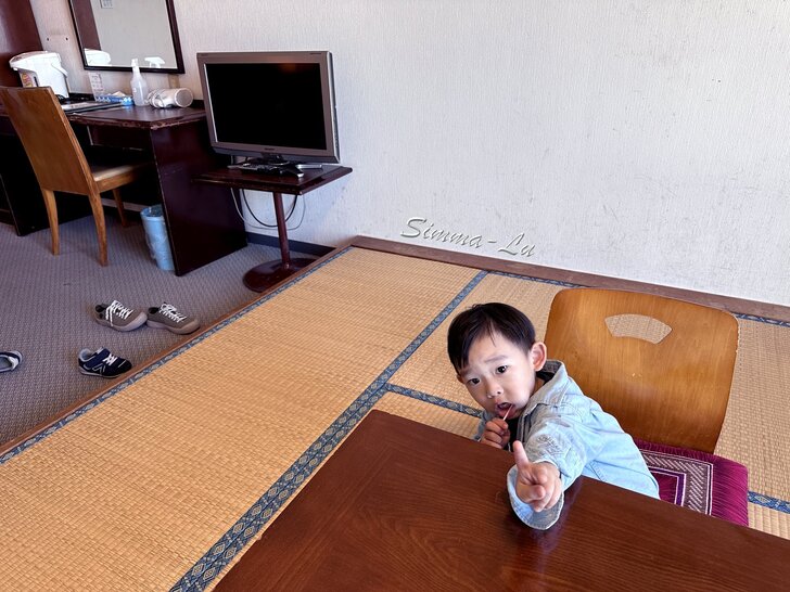 下榻的飯店,靠海的建築 雖然有點老舊~但整理得乾淨 每間房間都面海 房間內除了床鋪 還有塌塌米的鋪設 小朋友又一個日式體驗