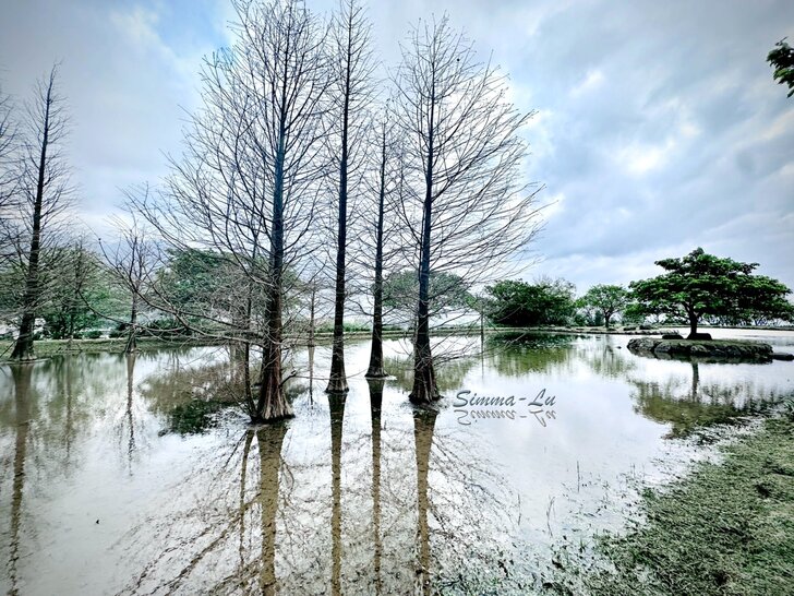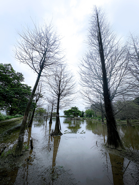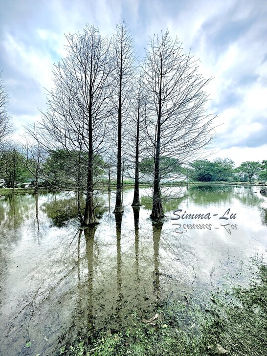 水中央的落羽松因季節性的交替 冬季的紅褐剛消逝 夏季的翠綠還未見 . 一株一株枯枝顯露的滄桑 卻是另一種平淡 可以與世無爭 世界變得無聲