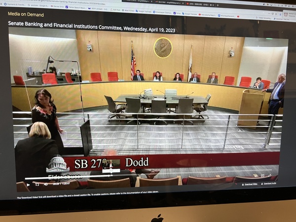 因為一旦資金進入加密貨幣生態系統—— 這不只是一項法案,它是一道防線。 我受加州消費者律師協會(CAOC)邀請,參與倡議行動。 2023 年,我第一次與一位代表 Pasadena 的參議員進行 Zoom 會議。我告訴他詐騙經過,並請求他的支持。 會議進行得很順利。 直到我提到,我從 IRA 提領資金匯給詐騙者。 那一刻,我突然意識到一件可怕的事—— 我全身發抖。 會議結束後,我的律師立刻打電話給我。 她害怕我承受不了壓力而崩潰。 是的,我當時脆弱到那種程度。 但那也是我開始改變的時刻。 加州有將近六百萬名長者。 我不再只是為自己作證。 第一戰參議院銀行與金融機構委員會2023 年 4 月 19 日 我和女兒從洛杉磯飛往加州首府——沙加緬度。 她建議我照稿朗讀。 她是對的。 但我做了不同的決定。 我對她說: 「如果他們只聽到文字,也許會忘記。 所以我沒有照稿。 那天我是第一位作證者。 英文是我的第二語言,我說話較慢。 在我結束後,她溫柔地提醒下一位發言者注意時間。