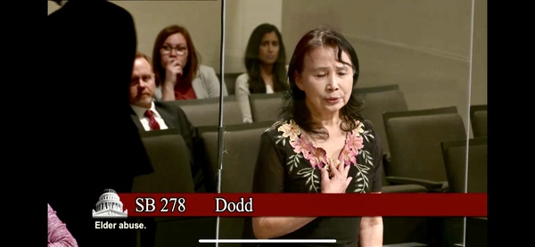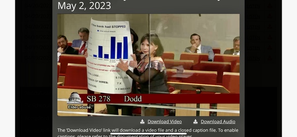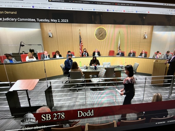 那份善意給了我力量。 我在發言時沒有哭。 但當我走下台,坐在前排證人席時,第二位證人開始發言。 然後,眼淚來了。 不是安靜的流淚。 我沒有帶紙巾。 參議員就在幾英尺外。 他們全都看見。 傷害不再抽象。 這不是安排。 投票結果:4 比 3。 SB 278 通過委員會。 我們贏得了第一戰。 第二戰參議院司法委員會2023 年 5 月 2 日 這一次,我只有兩分鐘。 現場有 11 位委員。 每一秒都至關重要。 為了節省時間,我帶了一張圖表,整理時間線、重複匯款、危險警訊—— 當我指著圖表說明時,不小心稍微踏出了證人應站的位置—— 一位議員溫和提醒我站回框內。 我一驚。 在那一瞬間的緊張與移動中,我失去了寶貴的幾秒鐘。 兩分鐘裡,每一秒都無比巨大。 因為那幾秒延誤,我快要講不完。 主席喊道: 「Mrs. Lin…」 一次。 第三次提醒時,我完成最後一句話才停下。 他再次讓我講完。 我在發言時依然沒有哭。 但坐下後,眼淚再次失控。 這不是演出。 而是一個倖存者正在他們面前流血的傷口。 如果不是在那個議事廳裡,我可能早已放聲痛哭。 但我撐住了。 因為我不是只為自己發聲。 我是為近六百萬加州長者。 一位原本猶豫的議員看著我說: 「看看林女士。她不會有第二次機會。 那一刻,我流淚了。 不是因為悲傷。