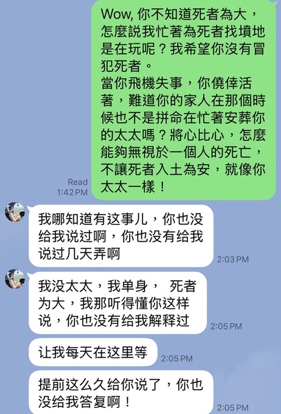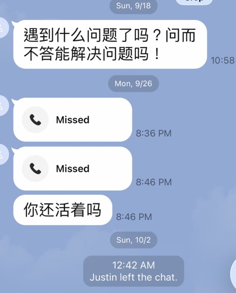 9/16/2022 -9/18/2022 我不再回覆他的訊息。但他沒有放棄,一次又一次試圖聯絡我。 9/26/2022 他情緒崩潰,分別用 Line 和微信打了兩次電話給我。我沒有接。