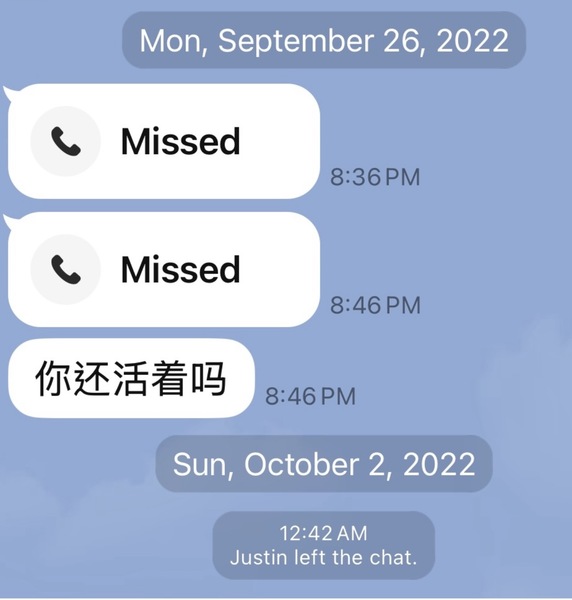 9/26/2022 那一天,他留下了最後一句話——「你還活著嗎?」 你還活著嗎? 10/02/2022 騙子退出了聊天群組。 |