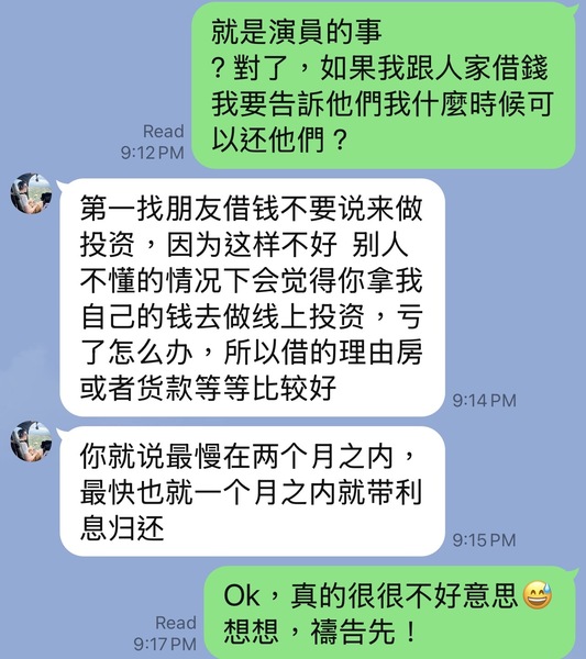 我怎麼發現這是一個騙局? 騙子還讓我繼續投資,說投越多賺得越多。他說借錢投資最終是值得的。 我不喜歡向親人借錢。不過,由於騙子一直催促我追加投資,我還是向女兒開口借錢了。 我女兒起了疑心,因為我從未向她借過錢。經過一番簡短的調查,她發現我成了殺豬盤騙局的受害者。 我女兒和家裡其他人馬上試圖聯絡執法單位。同時,我裝作鎮定自若,繼續與騙子保持聯繫,以免讓他們察覺自己的謊言已被識破。同時執法部門可以利用這種聯繫來進行調查。 在此期間,騙子——或者可能不只一個人——催促我繼續投資,而我則以各種藉口推脫說自己眼下無法投資。