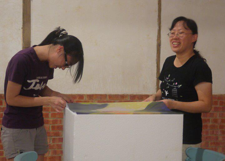 大拼圖部分是精彩的闖關活動之一,共精選了六幅畫作,具型的拼圖讓人印象深刻,可以達到寓教於樂的效果。爲了製作精美的大圖,從拍照、圖片處理到輸出,的確讓人頗傷腦筋,最後終於來到貼圖的時刻了。 我們先從保麗龍工廠裁回了六十公分見方的正立方體,拿到同樣裁好六套各九張六十公分長寬的大圖後,開始在客家大院裡完成拼貼工作。先把六套圖片依序放好,貼的時候確定每塊保麗龍立方體六面都有貼到不同圖片即可。只是一直在思考:到底要不要讓立方體像魔術方塊一樣的貼法,貼完後每一面都可以拼出圖案?不過因為只有九個保麗龍,當初只是做大平面的拼圖,所以只要可以拼出一面即可,有機會再來做做看魔術方塊式的,這種製作跟遊戲的難度一定更高。 根據以往的展場經驗,本來以為要把圖片貼平很不容易,所以剛開始撕開每張大圖後面的背膠時都小心翼翼,一點一點的慢慢撕、慢慢貼,怕貼歪了就很難撕下來重貼。還好貼起來比我想像中順利多了,後來乾脆一次撕完,兩個人合作對齊四角貼上即可。 九塊拼圖好不容易都貼完了,也終於看到辛苦的成果了,不過爲了保護大拼圖的使用壽命,還要在每個邊上貼上膠帶保護。 認真的流東美少女~