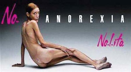 今年時裝週期間,米蘭市街頭及報紙上出現一組由身材乾瘦的法國女演員伊莎貝爾·卡羅裸照組成的宣傳海報。海報作者、義大利攝影師奧利維耶羅·托斯卡尼接受英國《每日郵報》採訪時說,他製作這組海報是為義大利女裝品牌No-l-ita宣傳,更是向時裝模特中厭食症病例日益增多的病態現象說不。現年27歲的卡羅身高165㎝,體重僅31㎏左右。卡羅患厭食症近15年,其間多次因體重過低入院接受治療。