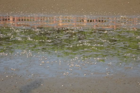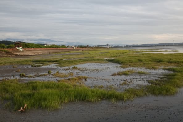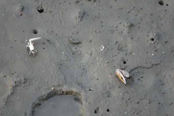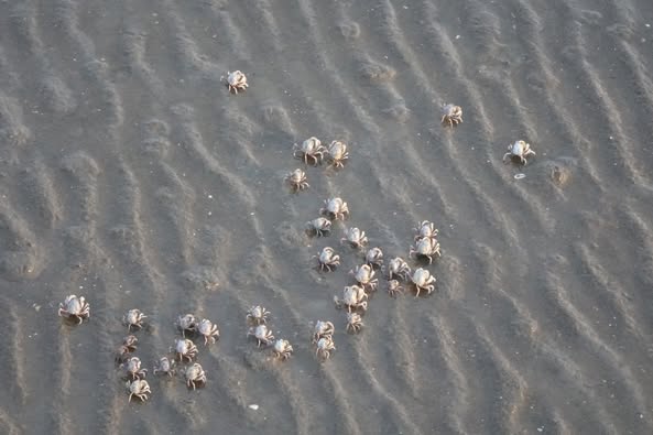 傍晚退潮時,來到海邊鋪設的步道,濕潤的海灘上低下頭就可看見許多螃蟹出來活動。這些螃蟹的外型有點不同,一位志工剛好走近,順便請教如何辨識這十餘種的螃蟹,還分公或母。這位志工在此地十餘年,對此地的生態很熟,也給遊客上了一生態課程 2025年5月10日新竹香山