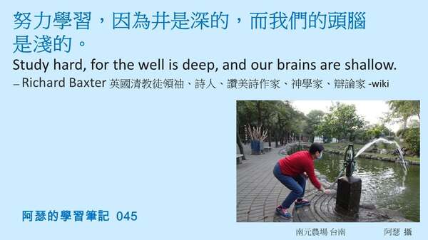 Study hard, for the well is deep, and our brains are shallow.― Richard Baxter 英國清教徒領䄂、詩人、讚美詩作家、神學家、辯論家 -wiki