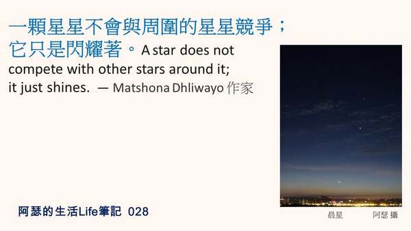 A star does not compete with other stars around it; it just shines. ― Matshona Dhliwayo 作家