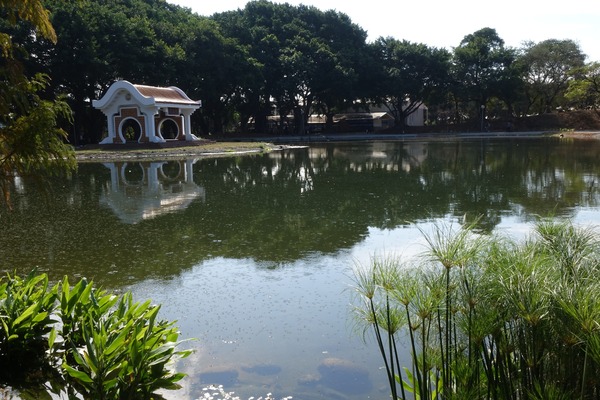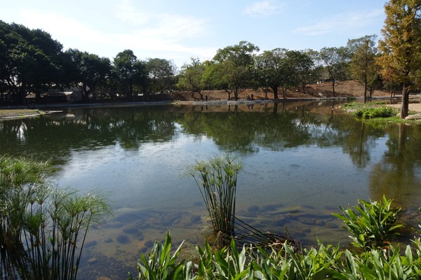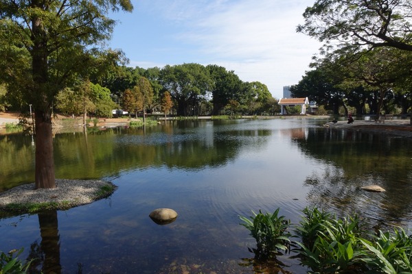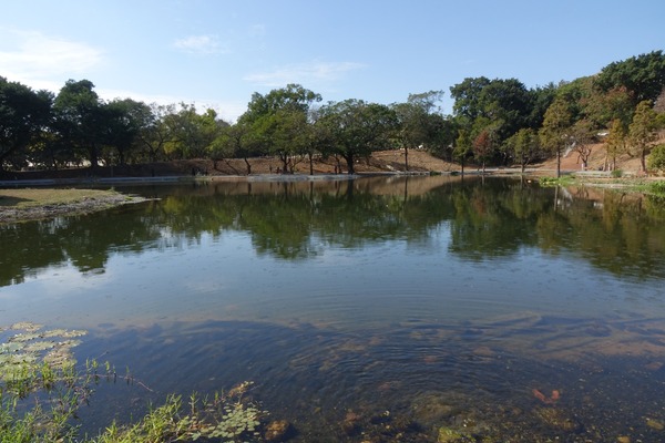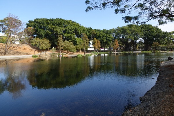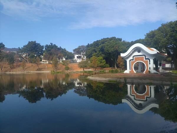小王子玫瑰花園旁有一個人工湖,在風平浪靜和晴空下,光滑如鏡,湖面倒影天空的藍和湖邊的樹木,構成了一幅美麗的畫。沿著湖邊走一圈,也以不同角度欣賞這小而美的湖。湖畔設有長椅,可供來客在椅子上坐上片刻,靜靜欣賞風景或沉思。2025年1月10日 台中東海