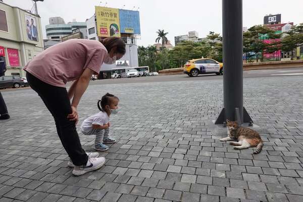 大街上看到一個小女孩彎著身體,眼睛專注前方一隻躺在地上的貓。這三或四歲的小女孩顯然對眼前那隻貓很感興趣,想靠近一些,卻又不敢,只好半蹲在安全距離外,兩眼專注地看那一隻貓。女孩愛貓或許是天性,那一隻貓會在街上出現已經見多識廣,習慣被人看,也懶得理小女孩。對小女孩而言在街頭遇見一隻貓卻是很新鮮的初識。攝於新竹街頭