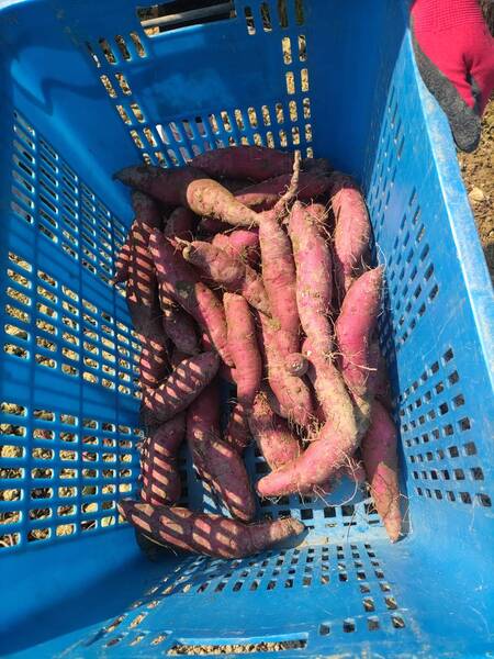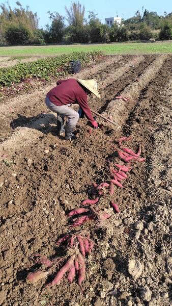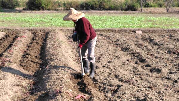 真的農夫拿起鋤頭先示範如何挖地瓜,但是又不能傷到地瓜,片刻後臨時客串的農夫就開始挖起來。田裡揮動鋤頭幾下,就看見成串的地瓜自泥土裡露出來,頗有成就感。對平常搖筆桿和打鍵盤的人,幾十年沒接觸鋤頭和土地,這是很新鮮的事。挖了一陣子,看挖出的地瓜已有一些,就休息。真農夫還稱讚說客串農夫的表現有模有樣。挖起的地瓜秤重付錢,依真農夫指示,放置幾天後才食用。栗子地瓜的品種吃起來細緻甜美,又是自己動手挖的更好吃。 2026 1/8龍潭