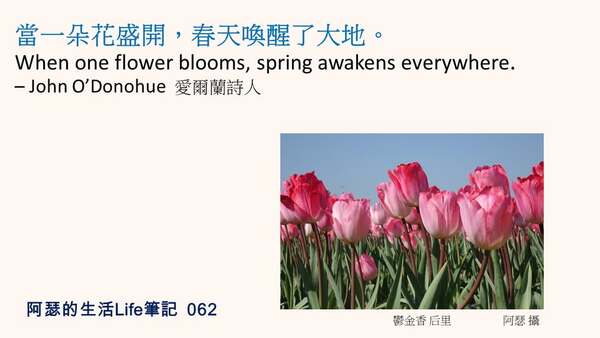 When one flower blooms, spring awakens everywhere. – John O’Donohue 愛爾蘭詩人