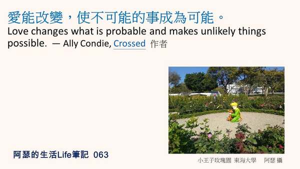愛能改變,使不可能的事成為可能。Love changes what is probable and makes unlikely things possible. ― Ally Condie, Crossed 作者