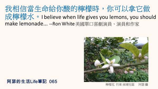 我相信當生命給你酸的檸檬時,你可以拿它做成檸檬水。I believe when life gives you lemons, you should make lemonade... --Ron White 美國單口喜劇演員、演員和作家