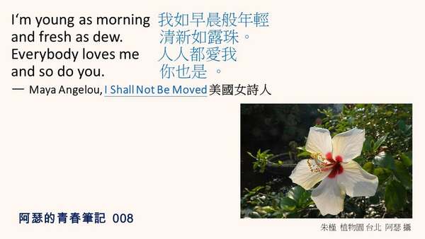 I‘m young as morning and fresh as dew. Everybody loves me and so do you. 我如早晨般年輕 清新如露珠。 人人都愛我 你也是 。 ― Maya Angelou, I Shall Not Be Moved 美國女詩人