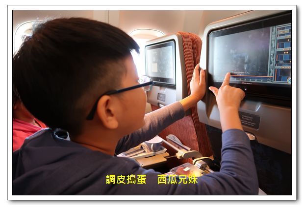 我們的座位是左邊靠窗三人,想當然爾是我和西瓜兄妹一起囉.. ![]() 西瓜汯,深深的被這小小的螢幕給吸引