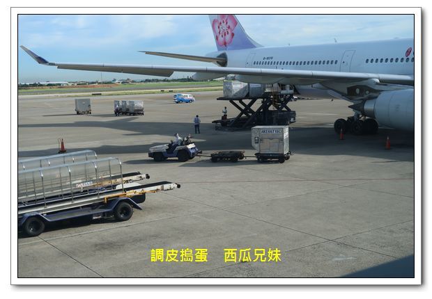 出遊日:106.07.05(星期三) 哈哈哈...哈哈哈...這麼久沒有出國,今天終於如願以嘗,可以出國轉一轉啦!我的護照早早就過期了,另外還要幫兄妹倆新辦護照,還沒踏出國門,就開始花錢了.... 我們這次行程是韓國五日遊(跟團),第一次帶西瓜兄妹出國,還是跟團比較保險,省時省力不煩惱... 我們搭乘早上7:45的華航班機, 這就是我們今天要搭乘的飛機喔.. 行李陸續送進飛機肚 塞呀塞..等你吃飽了,我們才能出發 西瓜紫坐在平台上,眼巴巴的望著窗外