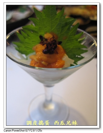 (2)海鮮精品(三選一) 【御饌海膽刺身】 底下也是用山藥絲當基底,背後那片是紫蘇葉。