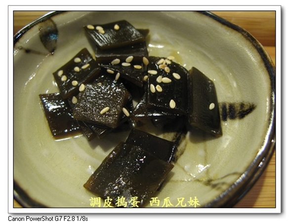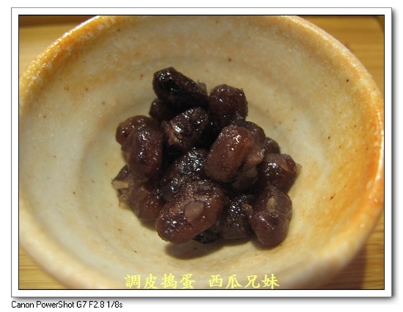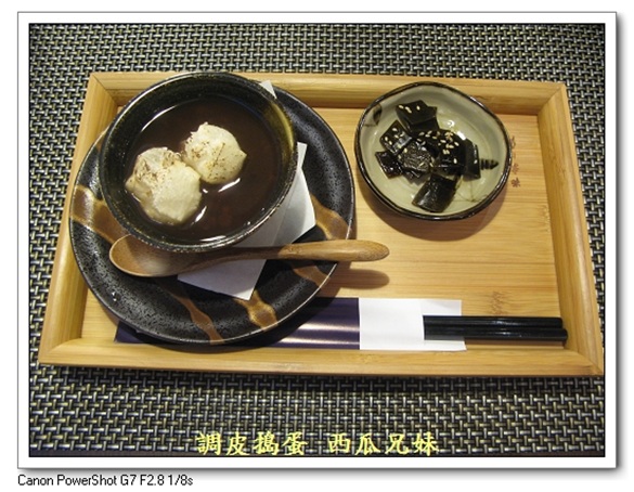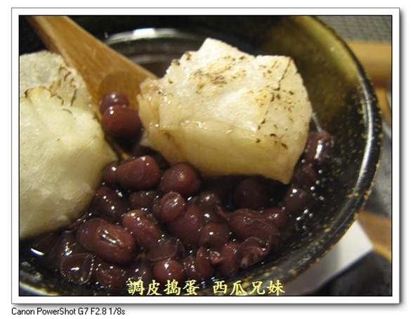 (8)甘味(四選一) 【年糕紅豆湯圓】 年糕是經過烤過的,膨膨的~ 夫婦善哉--紅豆湯專賣店,送來的時候,也是搭配一小碟的鹹昆布喔!