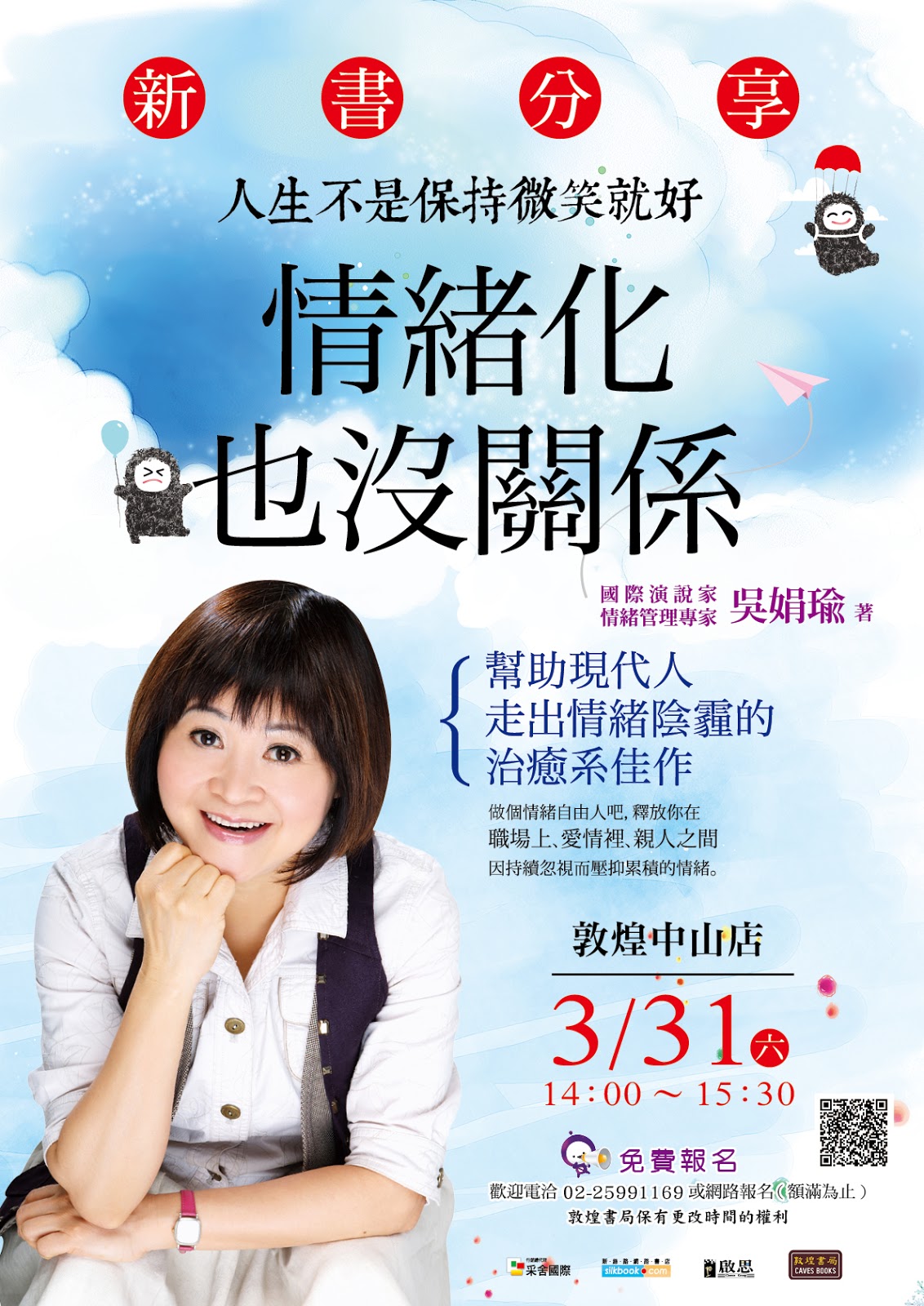 3/31(六)1400-1530 吳娟瑜與您相約 新書分享會 <人生不是微笑就好-情緒化也沒關係> 敦煌書局中山店-免費報名 電洽02-259911689 您常被人說你好情緒化嗎? 你自己覺得自己是很情緒化的人嗎? 就算情緒化,又如何? 人本來就是理性與感性兼具,沒有情緒還是人嗎? 大家是不是把情緒化污名化呢? 如果大家偶爾有點情緒,發發脾氣,宣洩一下,其實沒關係的 娟瑜老師在這本書裡,用大家最常遇見的例子,用最實際的方法, 告訴大家面對情緒化的解方,讓大家與情緒和平相處! 不可錯過的一本好書!!推薦給大家!! 天秤魚 2018.3.30. |
