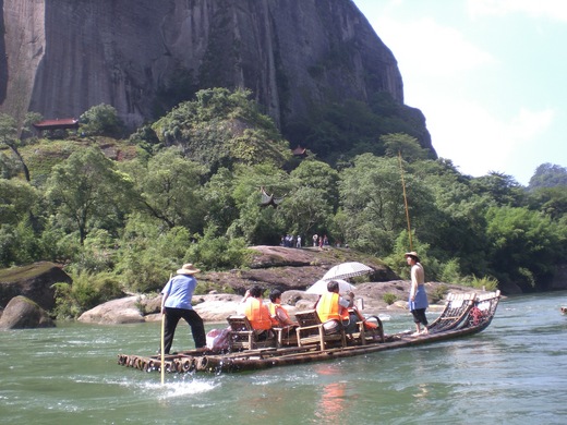 兩岸關係進一步解凍,同學相約在小三通全面開放首日,循線來趟武夷山七日遊,體驗歷史一刻。 武夷山位於福建西北,面積70平方公里,歷經億萬年大自然的鬼斧神工,形成奇峰秀水碧水丹峰地貌,有奇秀甲東南美譽,是為中國東南重要之旅遊景點。 一早7時自松山起飛8時不到飛抵金門,再由水頭碼頭乘渡輪約35分鐘航程到達廈門,鄭成功石像聳立港口歡迎我們。首站參觀佛教聖地南普陀寺,此寺為唐朝所建奉祀觀音為主,距今 千年歷史。福建沿海岩磐豐富,廟宇多依磐而建,岩中有廟,廟中有岩氣勢雄偉為一大特色。用畢素餐經由濱海公路前往廈門機場飛武夷山,由公路向海望去,小金門清楚的近在眼前。 此段公路乃填海所建,路面寬闊,為國際馬拉松競賽道路。分隔島上林木扶疏,一座座長跑雕像錯落其中, 現代化的景觀讓人耳目一新。據說側面大片豪宅區,當年都還是海灣,填海造地工程仍在進行,金、廈兩島連為一體,想必為時不遠。路經一處丈餘高「一國兩制統一中國」牌樓,正與 上了飛武夷山的飛機,因當地雷雨籠罩延遲一小時起飛,抵達時天氣轉晴。我們運氣不錯,雨神為我們讓了路,原本雨水不斷的山區,兩天的活動都是晴空萬里。 乘竹筏遊溪是此趟旅遊的重點,第二天一早5人一組沿九曲溪而下,沿溪兩旁岩壁林立景觀多變,蜿蜒盤折千蜂競秀,萬壑爭研。36峰99岩108景處處引人入勝。 40分鐘流程,看山看水聽船家編故事心曠神怡。 下午登「天遊峰」,據說峰頂舉目四望「千峰飛山,九曲環碧」盡收眼底。自山腳仰望峰高路峻 ,我等有自知之明 ,然一位80高齡團友,兩小時半山道走來面不改色 堪稱奇人 ,令吾等「後生」汗顏。 回程參觀朱熹書院。南宋理學家朱熹在此居住40餘年,設帳授徒著書立說。書院面積頗廣,景緻古意幽靜,保留了部份原始院牆供人懷古追思,不禁對中共文物保存用心起敬。 次日上午來到天心山的九龍坡,看千年茶樹「大紅袍」。九龍坡地處山窪盛產茶葉,有御茶園之稱,其鐵羅漢茶非常有名,大紅袍更受皇寵盛名遠播。 「大紅袍」是當地特有的茶種,相傳明朝時一位天山寺和尚,採自一處岩壁下的茶葉治好皇帝病,蒙賜紅袍而得名,另還有狀元得名前趕考遇救的版本。據說大紅袍現僅存4株,茶量極少且因此茶可連泡9次依舊清香,而被視為稀世珍品。然此樹虛有其表,一點感覺不出千年老樹的蒼勁,倒不如沿路磐壁小道,峰迴路轉來得有趣。 結束武夷山行程,火車前往福州。車上巧遇福州某高中遊畢武夷山返家的一群男女學生。我同學沈君曾客教湖南某大學,為流傳大陸「好久不見」歌詞原作,學生知道後興奮的圍繞著他求教曲、詞創作。 兩岸老、少打成一片交融甚歡 笑聲滿車廂,讓5小時多的火車之旅少了枯燥,大夥也不自覺的年輕了起來。 22日福州行程遊福州西湖、林則徐紀念館以及馬尾船政博物館。我和內人利用空檔,一早6點不到,由親人接往山區掃墓,過後轉回到老家祭祖,再到祠堂看看,和那年返鄉探親時一樣,一早堂內「麻將」聲四起,對我這「陌生人」的經過,依然不約而同的投以好奇眼光。 馬尾船政博物館規模不小,這裡紀錄了中國船務發展與海軍建軍史蹟,內容精彩詳實。好奇的在人物誌圖表中看到多位我海軍福州籍的老將名列其中,讓人有時空錯亂的感覺。 前往僑鄉泉州,參觀開元寺及天后宮兩座名寺。開元寺歷史悠久規模宏偉,寺內珍藏大量梵文石碑,寺前東西雙座南宋八角花崗石塔與千年古桑,和一件件傳說都讓我印象深刻。 遊罷繼續往廈門方向接近,所經之處石雕工廠林立,一路經過不啻看足了一趟露天石雕展。中途拜訪洛陽橋,此橋全長千公尺建於北宋,橋身以花崗石建造,有「洛陽之橋天下奇,飛虹千丈橫江垂」美譽,足見當年滔滔江河時的盛況,只是此刻見到的是河床乾涸,爛泥一片盛況只能靠想像。隨後來到惠安臨海一座抗倭名城「崇武古城」。古人已走遠,空留古城獨對月,倒是城下園內石雕林立,雕工精美讓人驚豔。 隨後來到與金門一水之隔的大嶝島,參觀<大嶝英雄三島戰地觀光園>,此處乃中共當年823砲戰陣地,金門多少官兵、百姓、重要將領就犧牲在這裡的「敵」砲口下。 園中有一「情緣茶莊」,據說許多過去兩岸砲戰老兵及播音員常在此聚會,一笑泯千仇成了朋友。只見海邊「一國兩制統一中國」與「三民主義統一中國」依舊隔海冷眼相對....。 昨日煙雲今灰滅..蒼海一聲笑,滔滔兩岸潮。讓走過烽火當年的我們不勝唏噓。 . 傍晚進入廈門,時值華燈初上晚霞滿天,濱海道上餐館林立遊客如織 。來到一處面海叫「外婆家」規模不小的「情調」餐館用餐。 外婆家... ? 淡淡的燈光又不許拍照,顧名思義 不免讓人莞爾。 . 夜遊中山路,長達數百公尺的徒步街,兩旁商家櫛比鱗次熱鬧非凡。走進一家百貨公司,裡面陳設與台灣相似,店員比顧客多的現象也和台灣相同。價格若以當地生活指數論並不便宜。 . 當晚夜宿陳由豪的 翔 鷺大飯店,雄偉的大廳前所未見(房間則略顯寒酸),不禁的讓我對陳董 債留台灣 起了聯想。 一早 費時兩小時的路程前往南靖山城看土樓。據悉全縣共有1300多座造型獨特的土樓,冷戰時期還曾被美空照誤判為 核子反應爐。 . 土樓在網路早有所聞,只是導遊很混,為了省時,帶我們看的是一座落破的閩式土樓,且非古蹟。百聞不如一見,還不如不見。 倒是南靖境內盛產香蕉,車行半小時,一路盡是延綿