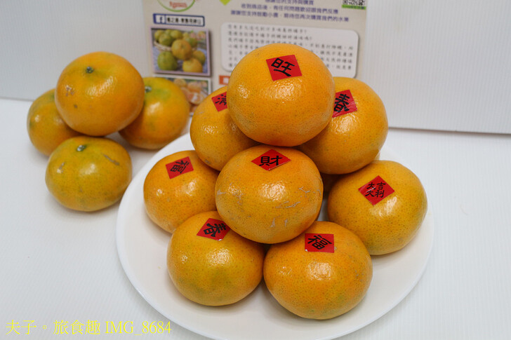 春節期間果皮貼上紅色新春小貼紙 「春、福、財、旺、大吉大利」更見喜氣,是走春訪友最佳伴手。