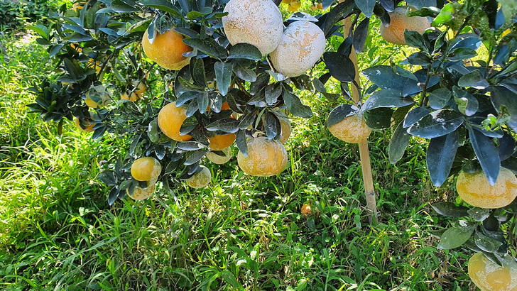 茂谷柑,三月中旬開花,果實翌年一月中、下旬成熟,果實成長期需要十個月,一年只有一收,期間果皮很怕曬傷有損賣相,夏季為避免果實被夏天火辣的陽光曬傷,園主傅爸爸會為茂谷柑噴上一層天然無毒的碳酸鈣粉 (CaCO3,也就是俗稱石灰粉)。碳酸鈣粉不僅可以反射陽光,還能降低茂谷柑的表面溫度,減少曬傷的風險,讓茂谷柑在燦爛的陽光下茁壯成長,自然轉色增甜,顆顆在欉黃才採收。