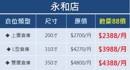 這個偉大的父親節裡,為了要替各位爸爸們解決家中困擾已久的空間收納雜症,收多易迷你倉在此打上促銷88價,讓辛勞的爸爸們在這節慶裡解決掉空間收納問題,改善家中居家環境,趕快呼朋引伴一起解決居問題吧! 活動時間:即日起到八月底 PS.不適用舊客轉倉. 倉庫數量有限,先租先贏!錯過了就不知道要再等待何時了喔! 中山店