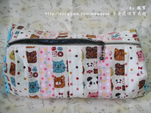 第一個動物圖案糖果包。以糖果七彩繽紛的顏色,選不同色彩鮮艷而活潑的點點布色,在配上卡哇伊的動物圖案花色。選擇條狀切割,白色為主,糖果包二側選了我最愛的藍色為總結,再縫上包釦,完成。