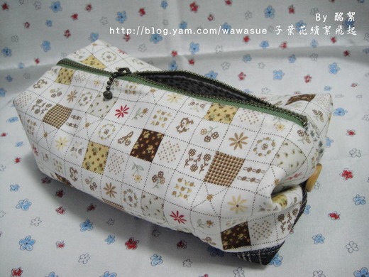 第二格子糖果包。這個我是先選了底部的布色,再挑上這塊格子花色。配了綠色拉鍊,和木釦。這個包型,我參考了某本手作書。